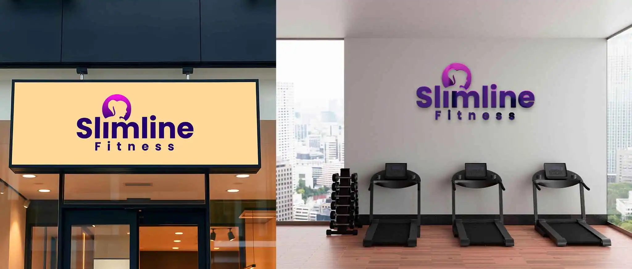 Our creative presentation showcased the Slimline Fitness logo in multiple mockups — from signage and apparel to digital platforms. The typography, color balance, and gradient flow were carefully crafted to maintain elegance while ensuring strong visibility and brand presence across mediums.